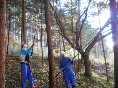職場体験学習の一つとして、林業体験を行いました。里山協議会の方の指導のもと、実際に枝打ち作業や除伐体験をしました。林業に携わる方の苦労や思いを感じることができました。