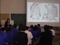 広報「きそまち」の4コマ漫画でもおなじみの西川かおり先生による講演会がありました。「しくじり先生」ならぬ、「しつこい先生~義仲の真実求めて幾年月~」というタイトルで、全校でお話をお聴きしました。漫画を描くことが大好きな女子高校生であった西川先生が、古典の時間、平家物語「木曽義仲の最期」を読んで、古典の先生のお話を聴き、義仲や登場する周りの人物に強く惹かれてしまったという出会い。そして、今日まで、さまざまな文献を読んだり、各地に足を運んだりしながら、真実を探ろうと調査をし続けてきたこと。義仲の漫画を描きたい!と思い、今その夢が叶えられていること。義仲館のリニューアルやそれまでのワークショップなどでも深く関わってこられている西川先生ですが、歴史だけでなく、先生の好奇心や夢に向かうエネルギーなどたくさんのことを学ばせていただく時間になりました。