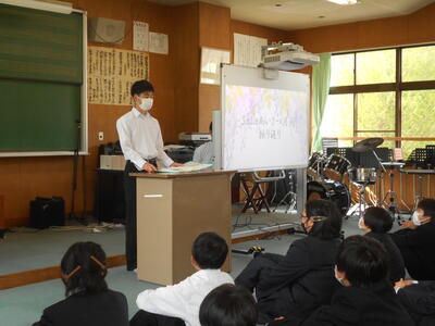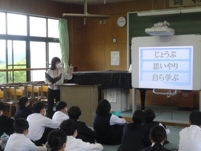 6月1日に中学校で校長講話が行われました。日義小中学校の学校教育目標「じょうぶで思いやりがあり自ら学ぶ子ども」について考える講話で、生徒自身が今どんなことを大切にしているかを問う内容でした。自分の考えを学習プリントに書き、友だちと意見交換したり全体で共有したりして、学校教育目標を改めて見返すきっかけとなりました。