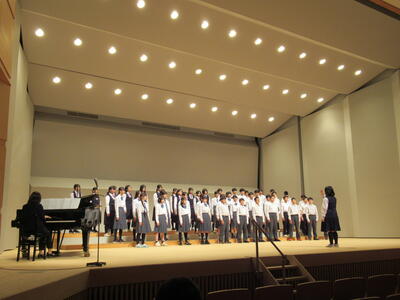 午前(小学校の部)に小学校5、6年生が参加し、「光の射す方へ」を美しい歌声でホールいっぱいに響かせました。午後(中学校の部)に中学校3年生が参加し、「あなたへー旅立ちに寄せるメッセージ」を大人っぽい歌声で堂々と発表しました。